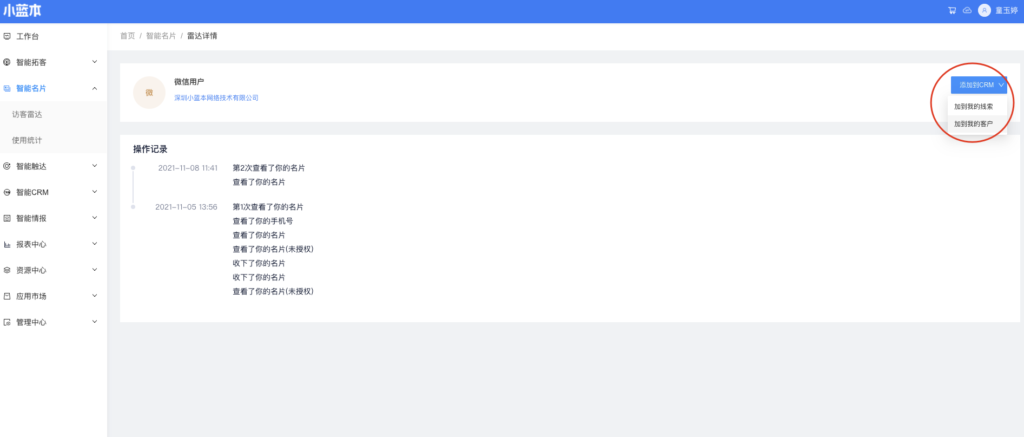 点击【查看详情】可查看名片访客的操作记录。点击【添加到CRM】,可将你感兴趣的访客添加为线索或者客户