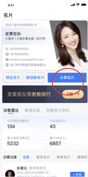 直发名片访客:通过app、小程序直接分享,进入我名片的访客