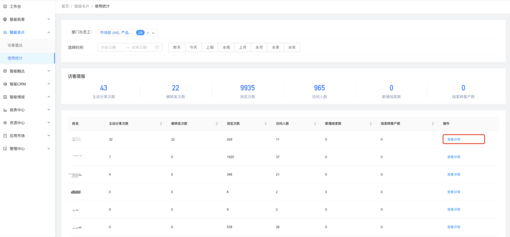 使用统计中可查看部门员工使用智能名片的情况,包括主动分享名片次数、转发名片次数、名片浏览次数、访问人数、新增线索数、线索转客户数。点击【查看详情】可进入访客雷达,查看员工名片的具体访客情况。