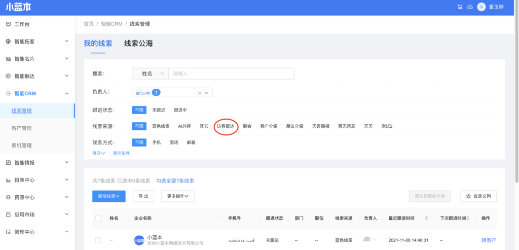 从访客雷达添加到CRM中的线索/客户,来源默认为访客雷达