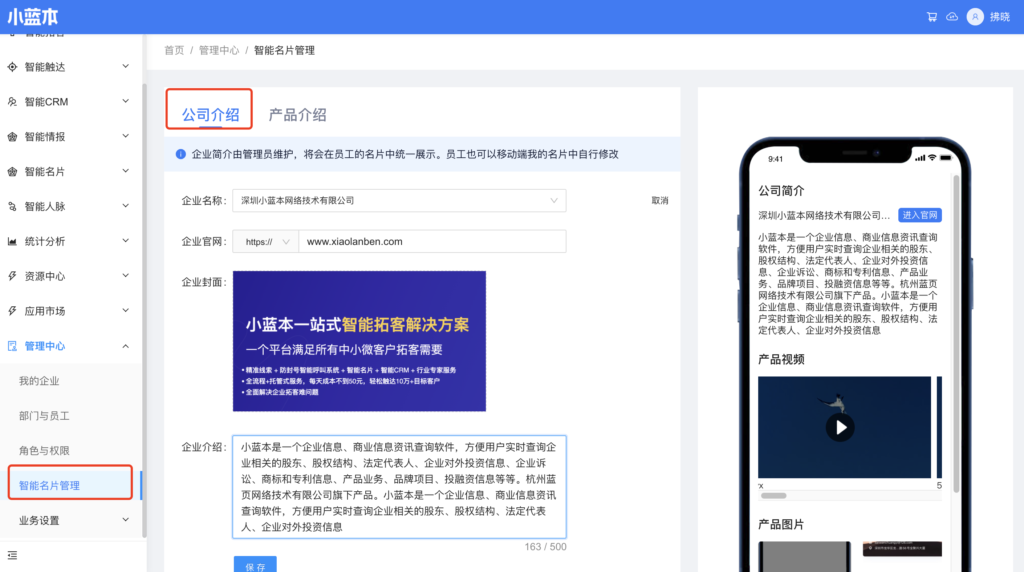 管理员进入【管理中心】-【智能名片管理】,可编辑企业名称、企业官网、企业封面图、企业介绍等内容