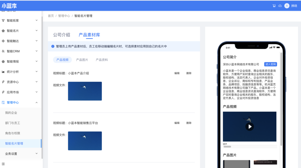 管理员可以在小蓝本PC端统一编辑公司介绍、批量上传产品素材库(产品图片、产品视频、产品资料),方便公司统一管理员工的名片。