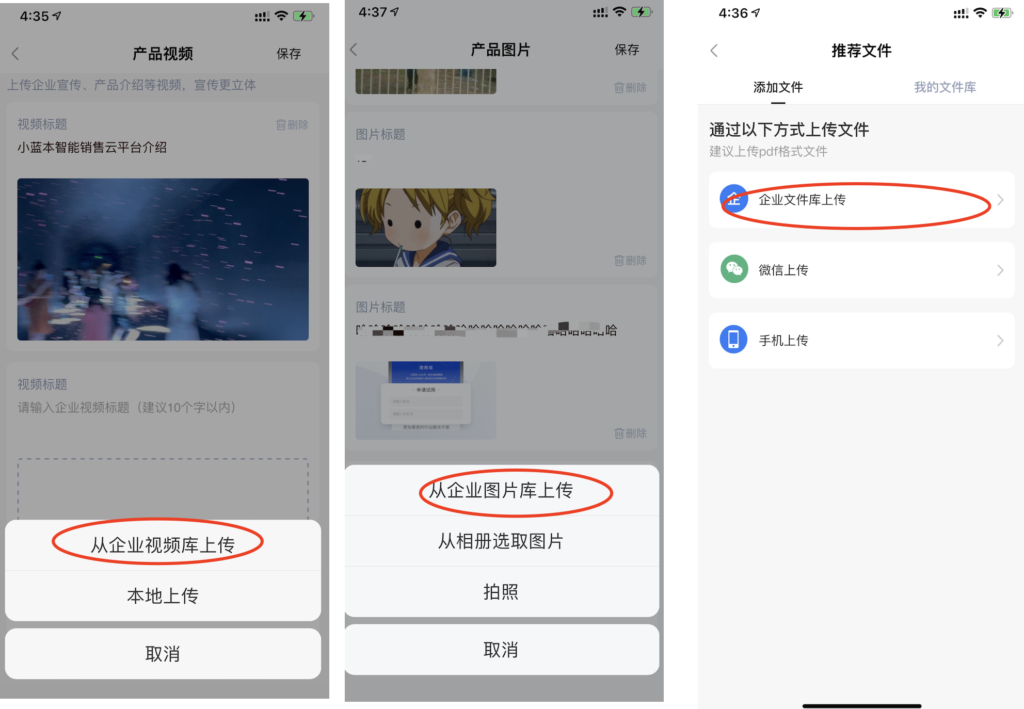 用户进入移动端名片编辑页面,可直接选择上传企业素材库的视频、图片、文件
