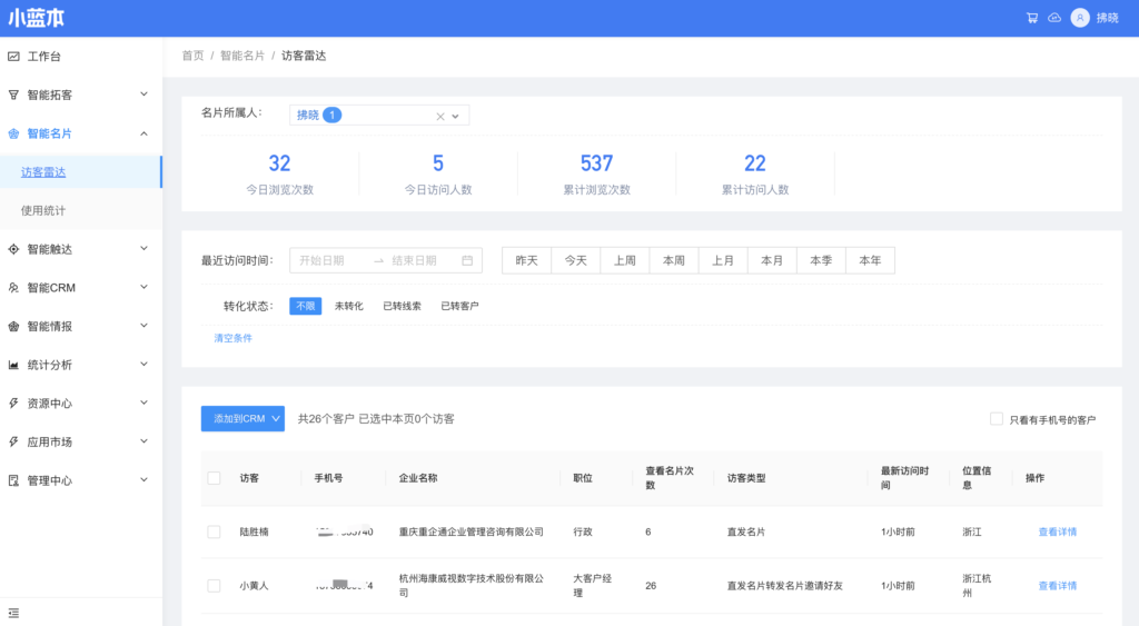 2、在访客雷达中可查看名片访客的具体信息,例如访客姓名、联系方式、企业名称、职位、查看名片次数、访客类型。点击【查看详情】可查看访客操作记录。