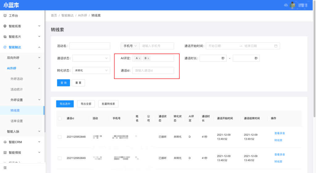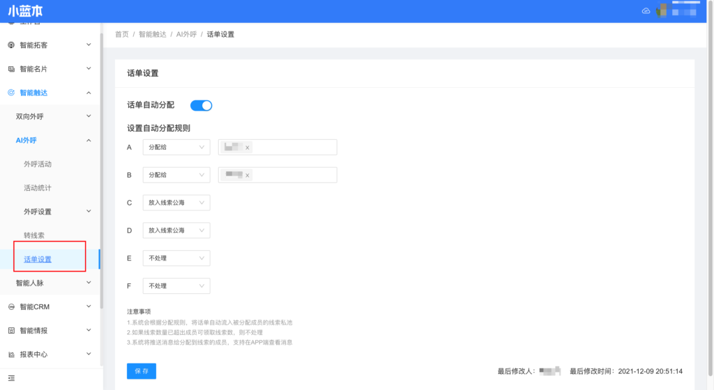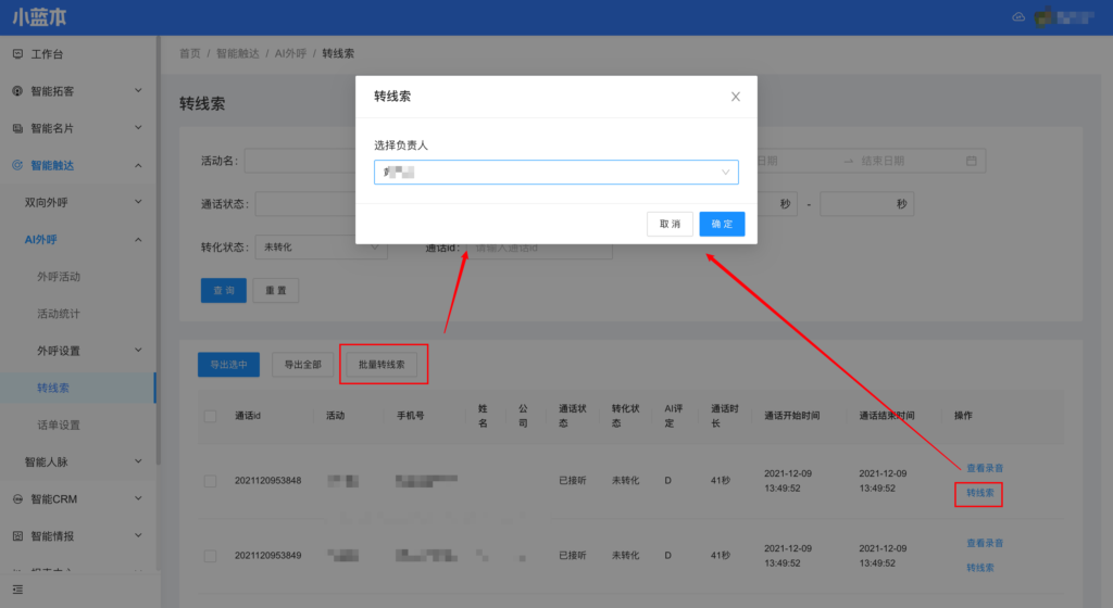 开启话单自动分配后,AI外呼拨打完的话单记录(可至「转线索」列表查看),将由系统根据设置的分配规则,进行分配;