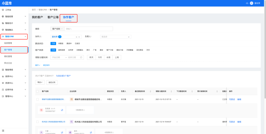 (1)在智能CRM-客户管理,新增tab页面【协作客户】。与【我的客户】、【客户公海】同级。