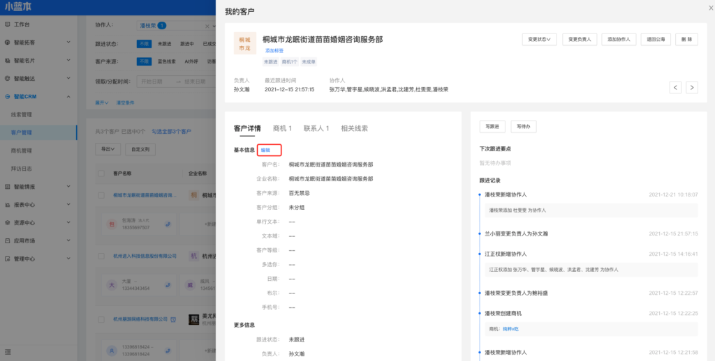 (3)协作人有权限编辑客户信息。编辑信息后生成跟进记录。