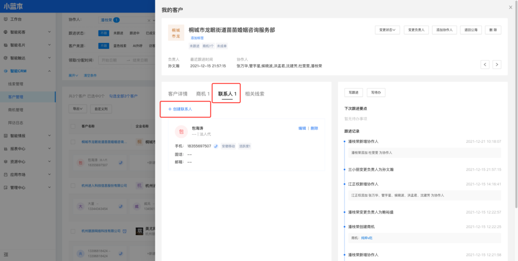 (5)协作人有权限新建联系人。新建后生成一条跟进记录。