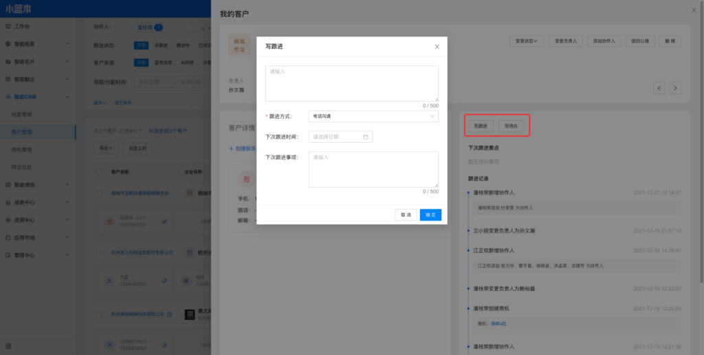 (6)协作人有权限写跟进、写待办。协作人和负责人的跟进、待办相互同步。