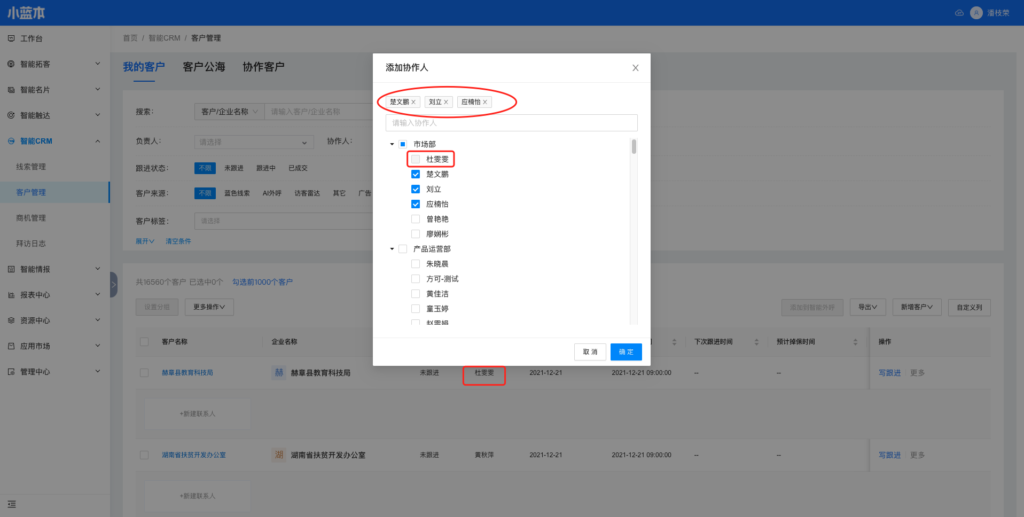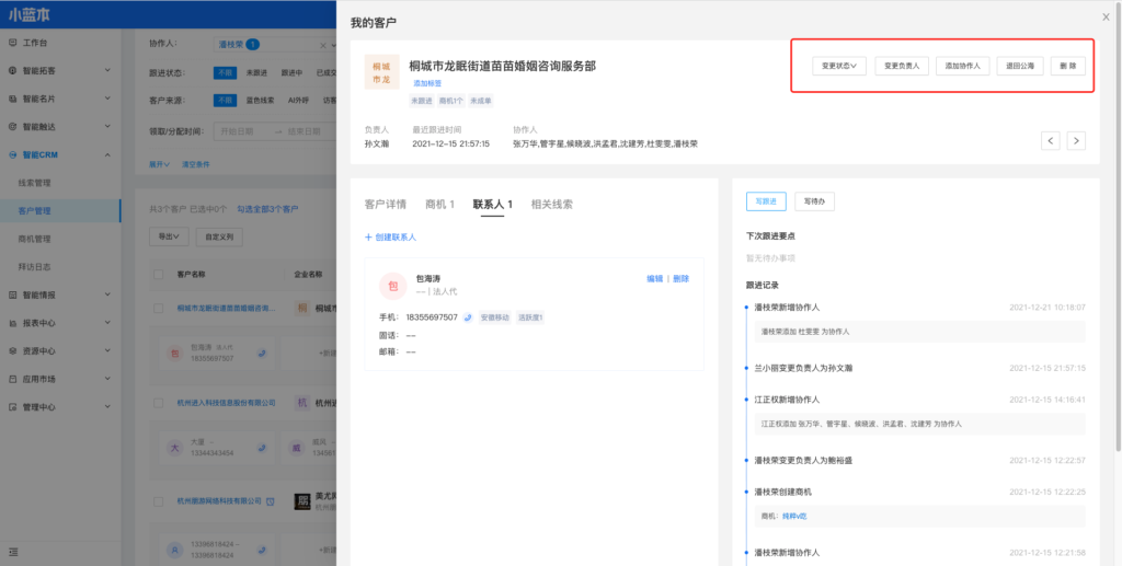 协作人功能,满足了一个客户需要多个销售、多个部门员工配合跟进的场景,解决仅唯一的客户负责人有权查看客户信息、跟进客户的问题。赋予协作人 查看客户、编辑客户、跟进客户、创建商机、变更客户状态等权限。