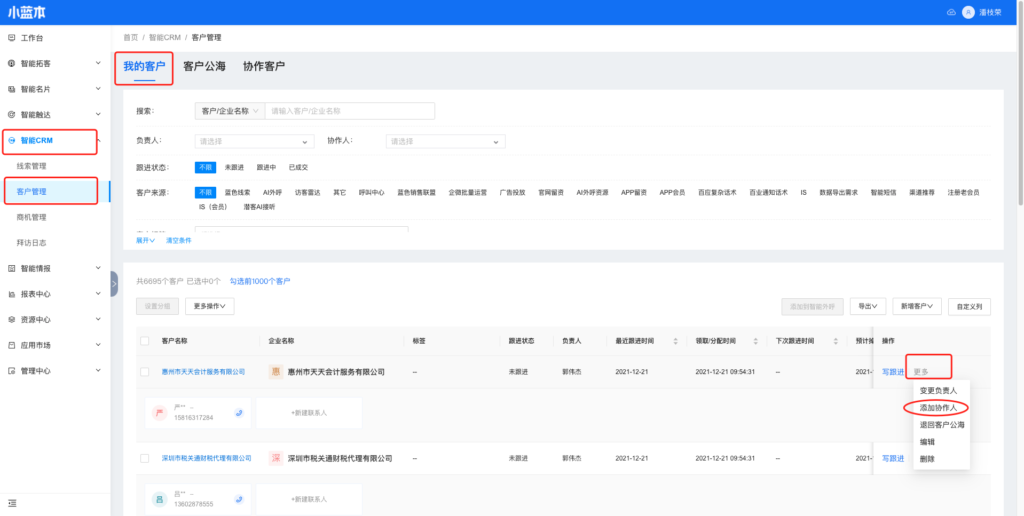 (1)入口1:智能CRM-客户管理-我的客户页面,客户列表,「操作」字段的「更多」按钮,新增「添加协作人」按钮。