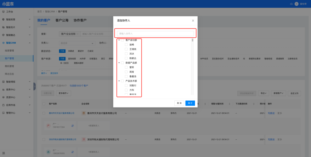 (1)点击「添加协作人」按钮,弹窗展示可供选择的协作人。
