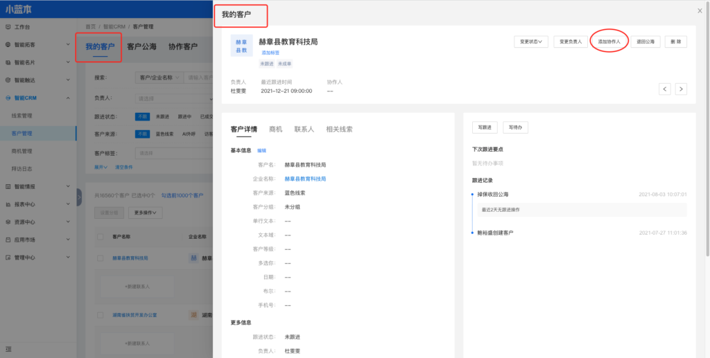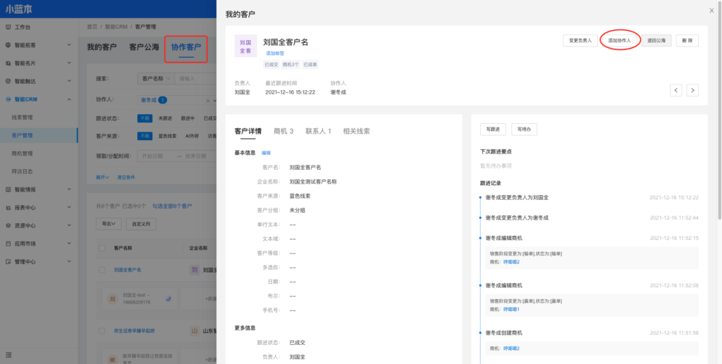 入口3:智能CRM-客户管理-协作的客户页面,客户详情,右上角「添加协作人」按钮。