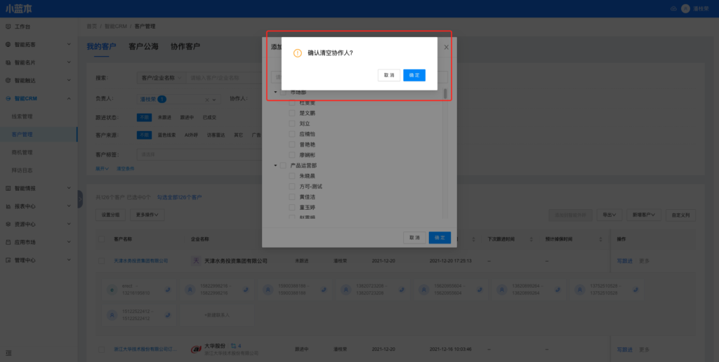 (5)协作人创建了商机,但是商机未成交或跟进中,删除协作人时其创建的商机一并删除。