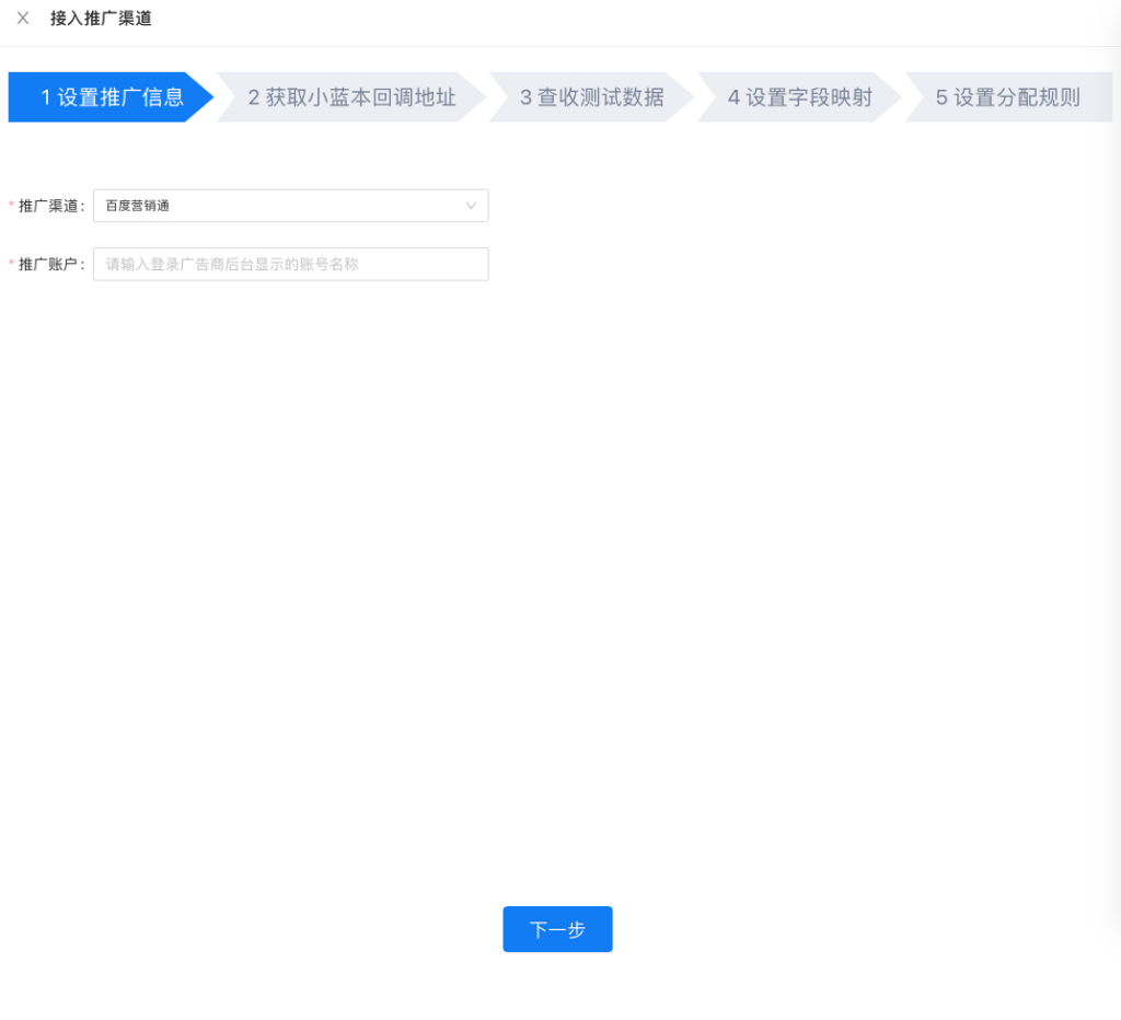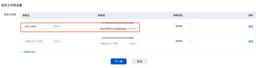 点击【添加自定义字段】,无论是否配置自定义字段,第一个自定义字段参数名必须输入auth_token ,否则推广平台的所有字段无法接入,将小蓝本接口信息中【小蓝本接入token/签名参数值】粘贴至自定义字段的参数值;第二个自定义字段起,参数名和参数值可自定义配置,设置完成后点击下一步即可。