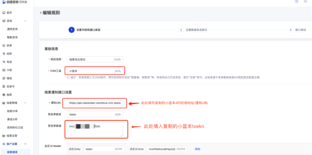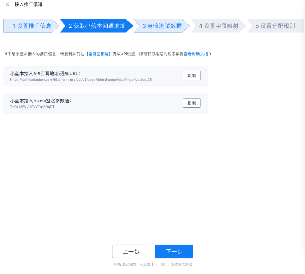 第一步配置完成后,会自动生成:小蓝本接入API回调地址、小蓝本接入token/签名参数名。