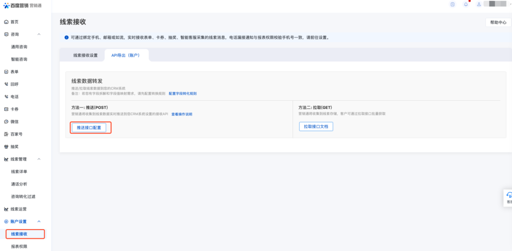 登录百度广告后台后,点击【账户设置-线索接收】,切换到【API导出(账户)】,点击【推送接口配置】,进入API配置页面。