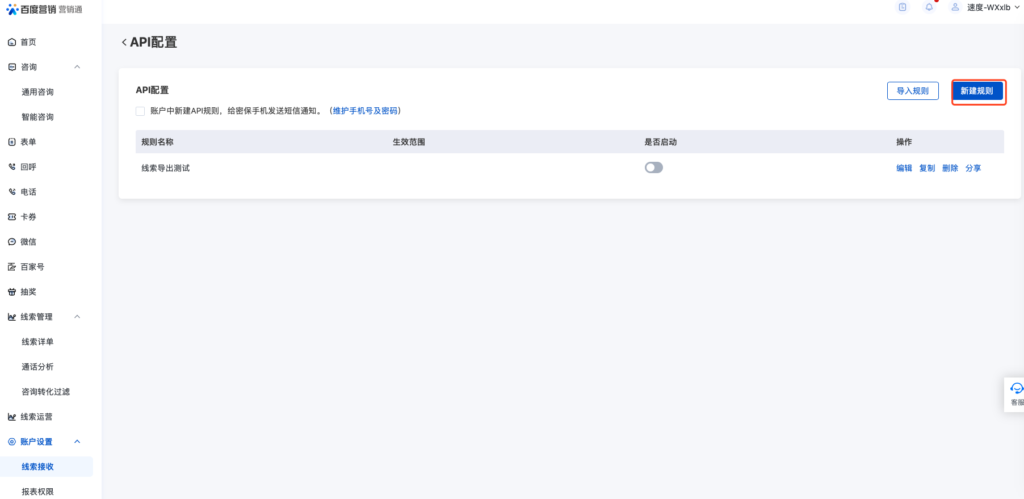 在API配置页面,点击【新建规则】,进入新建规则页面。