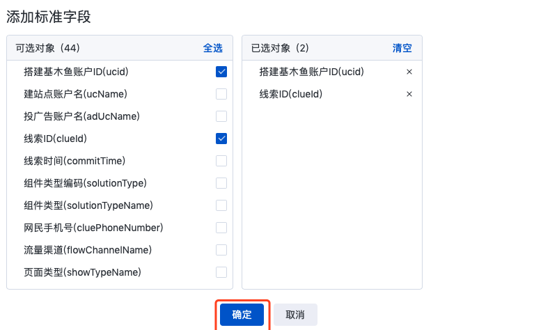 a、点击【添加标准字段】,勾选所需“标准字段”,完成后点击确定。