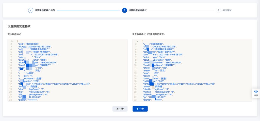 依据页面引导,点击【下一步】,进入数据发送格式页面。