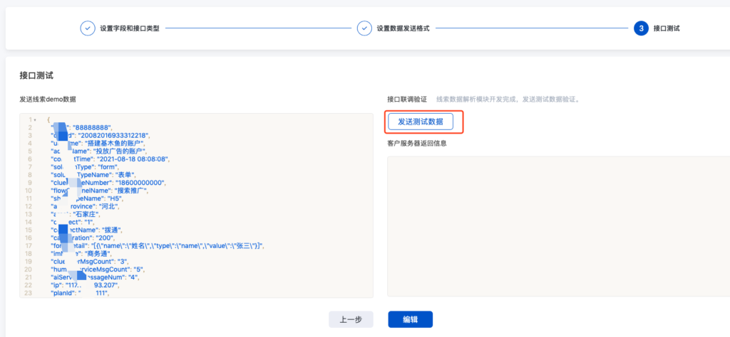 依据页面引导,点击【下一步】,进入接口测试页面。点击【发送测试数据】。