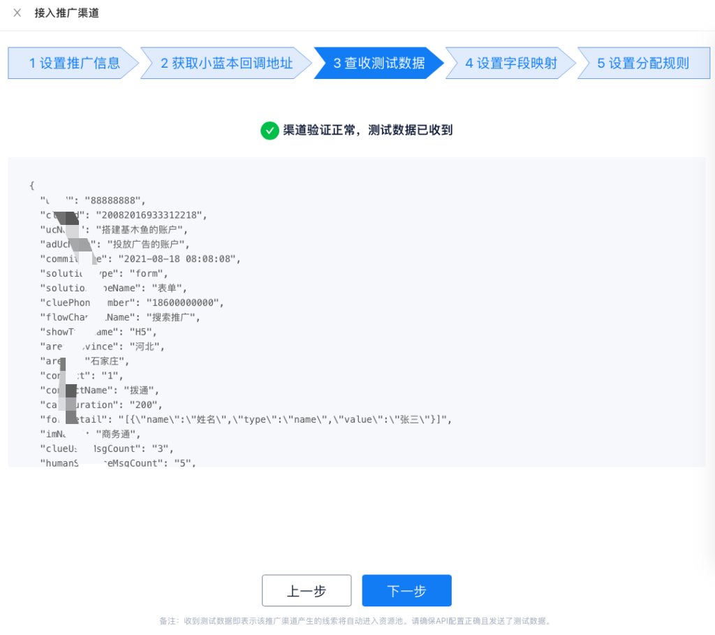 在百度推广平台完成API配置且发送了测试数据后,在查收测试数据会显示【渠道验证正常,测试数据已收到】表示推广渠道产生的线索将自动进入小蓝本资源池。
