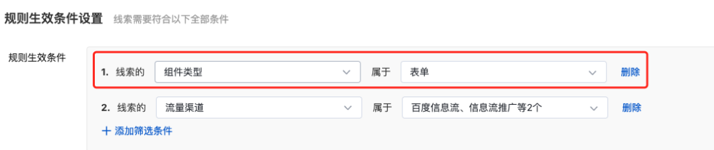 可以设置符合一定规则/条件的线索推送至小蓝本。其中,组件类型:表单(含抽奖)、卡券等,此项必填。