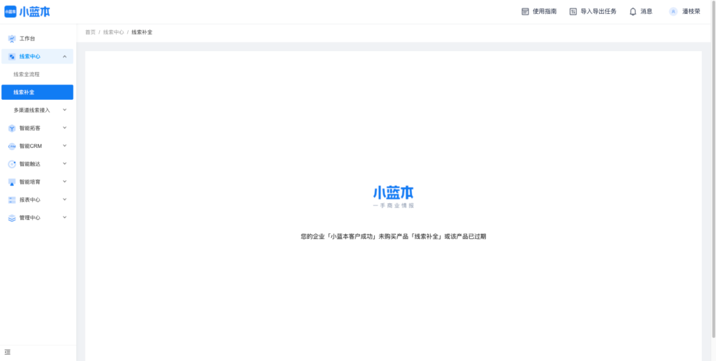 备注:如企业未购买线索补全功能模块,则提示未购买产品或产品已到期。