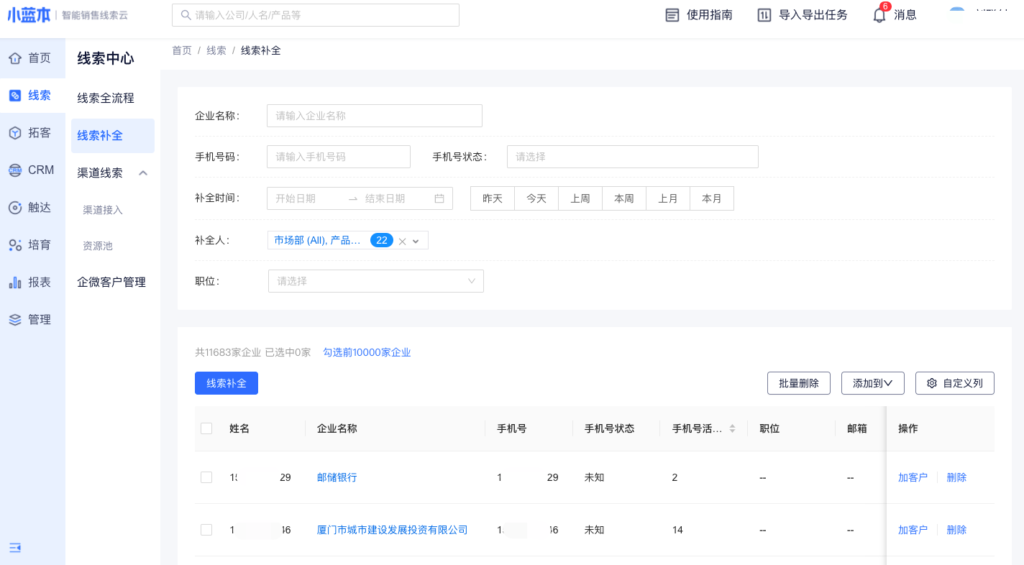 (5)补全列表的线索,支持添加到「我的线索」、「我的客户」、「智能外呼」。添加到「我的线索」、「我的客户」操作将同步解锁未解锁的企业。