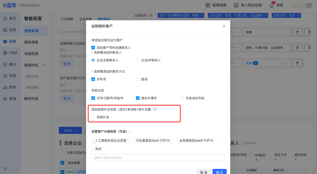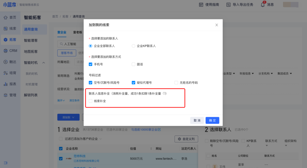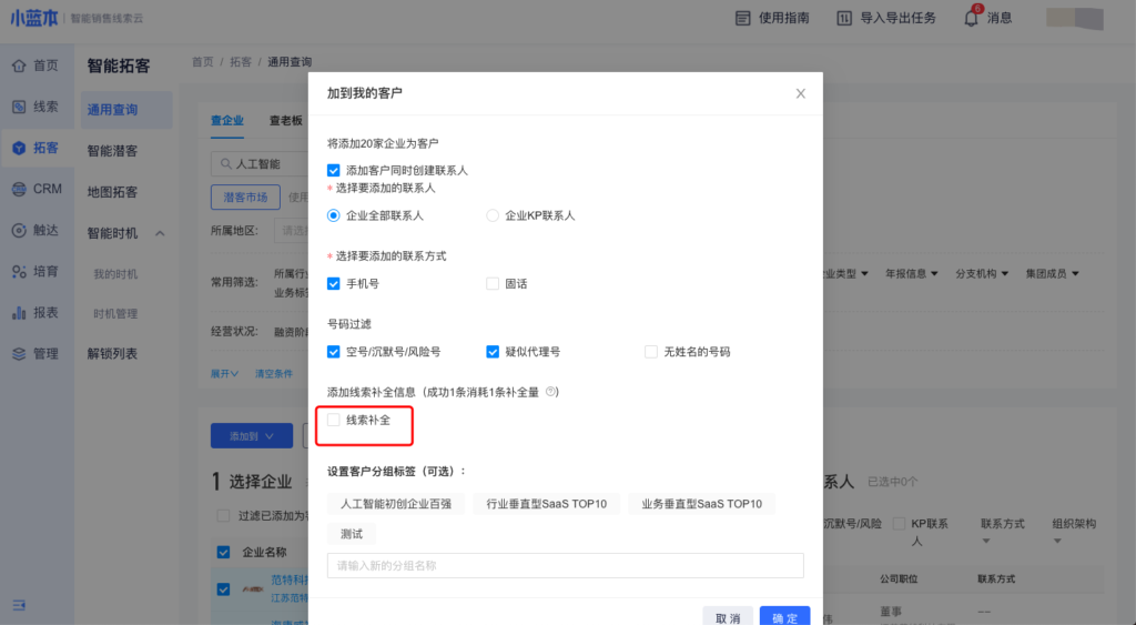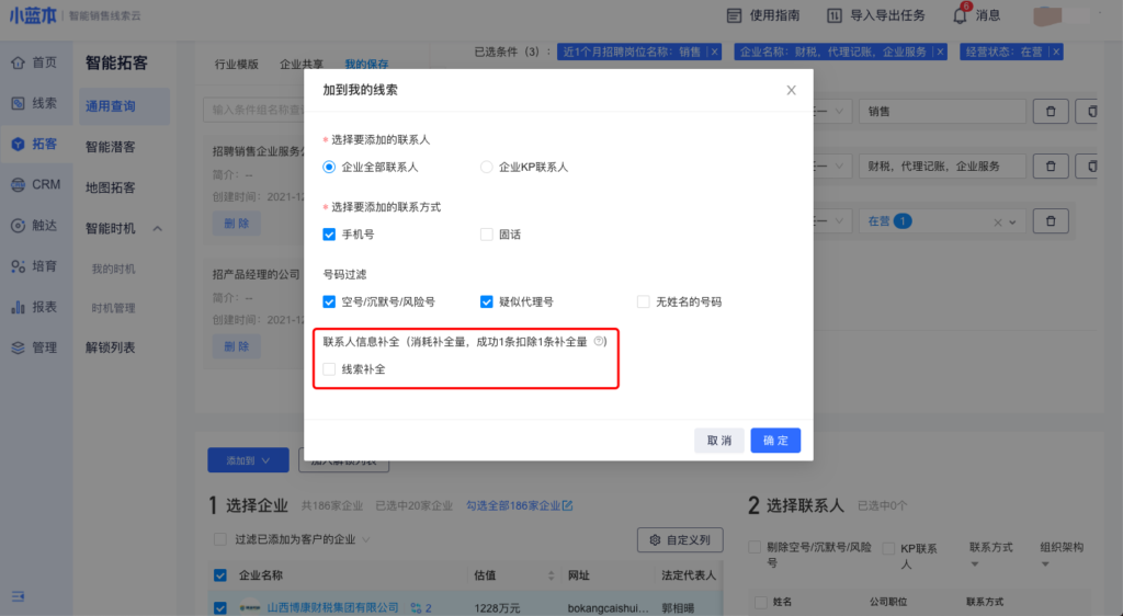 1.智能拓客-通用查询-查企业-添加到-加到我的线索-线索补全