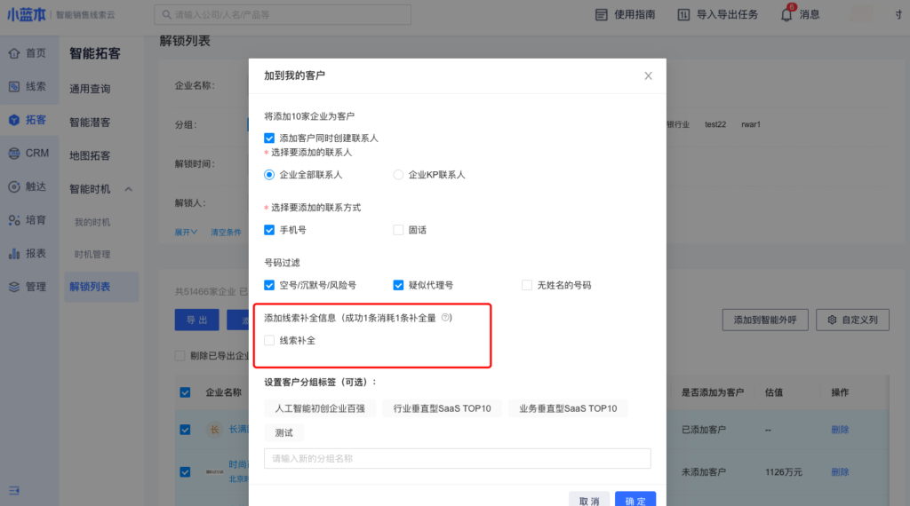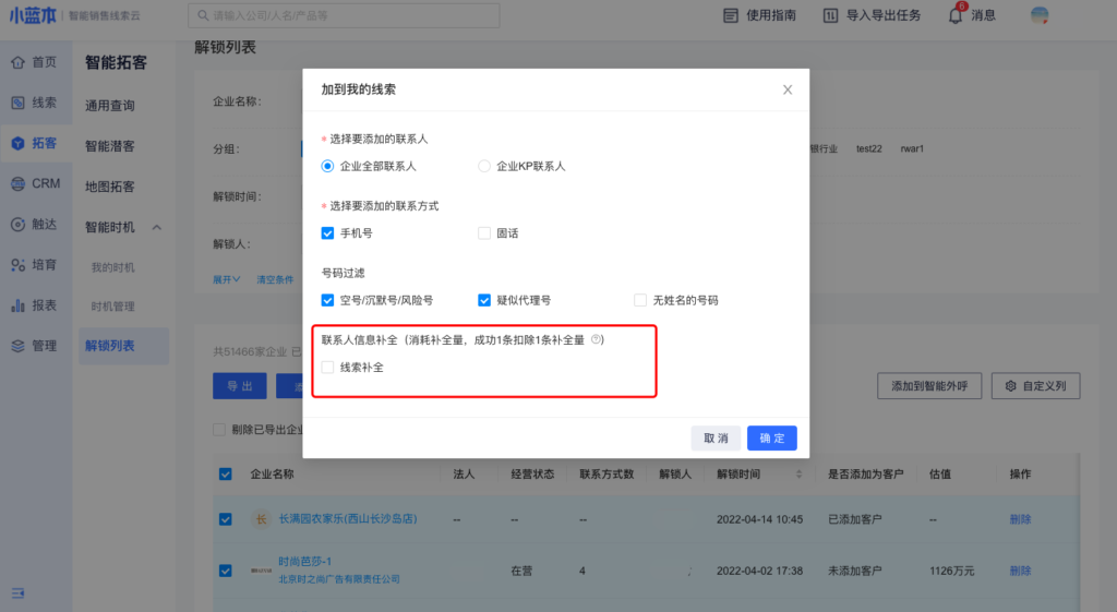 5.智能拓客-解锁列表-添加到-加到我的线索-线索补全