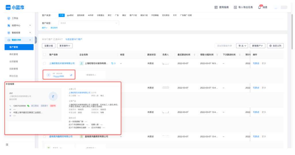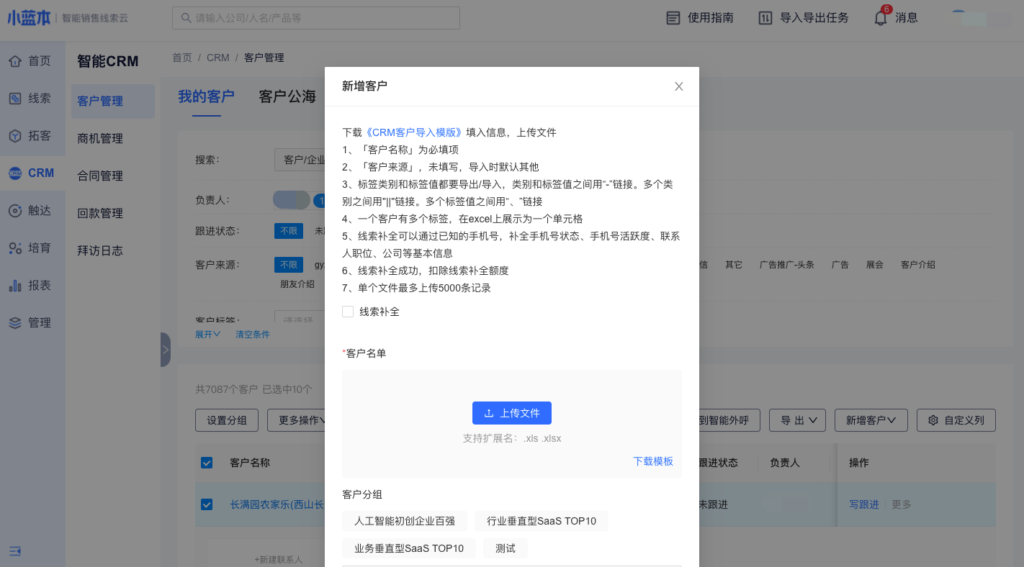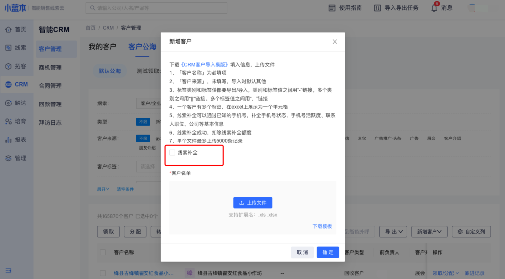 1.智能CRM-客户管理-我的客户-新增客户-批量导入-线索补全