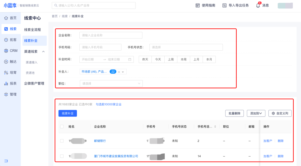 备注:如企业未购买线索补全功能模块,则入口隐藏不展示。