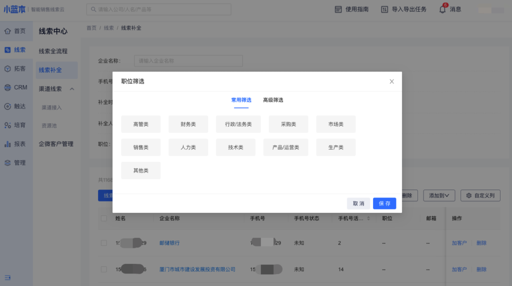 4.智能拓客-通用查询-高级搜索-添加到-加到我的客户-线索补全
