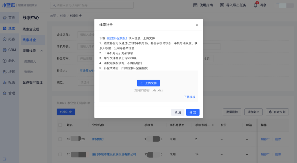 a.线索补全是满足用户基于已知「手机号」查询并补全用户完整的名片;具体操作如下:点击「线索补全」-「下载模板」-「上传文件」,补全成功的线索更新在线索补全列表。补全失败的在「导入导出任务」中心提示:未匹配到记录。