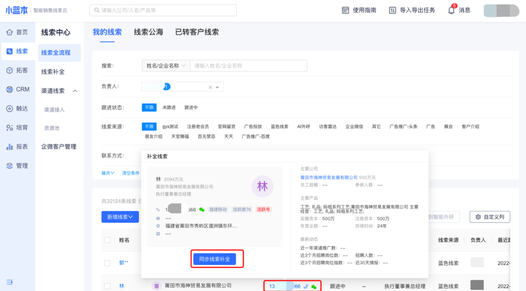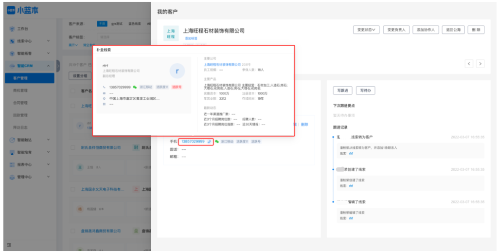 1.我的线索列表,经过线索补全的「手机号」高亮标蓝,悬浮弹窗展示「线索补全」信息。