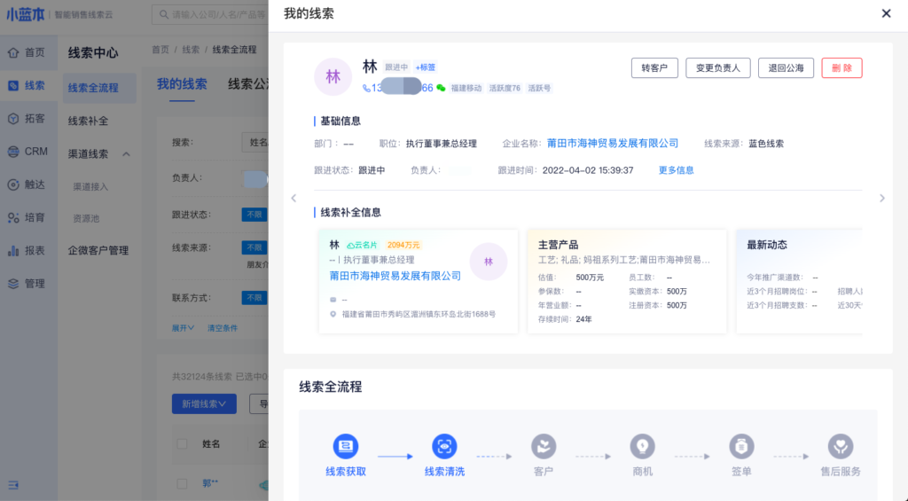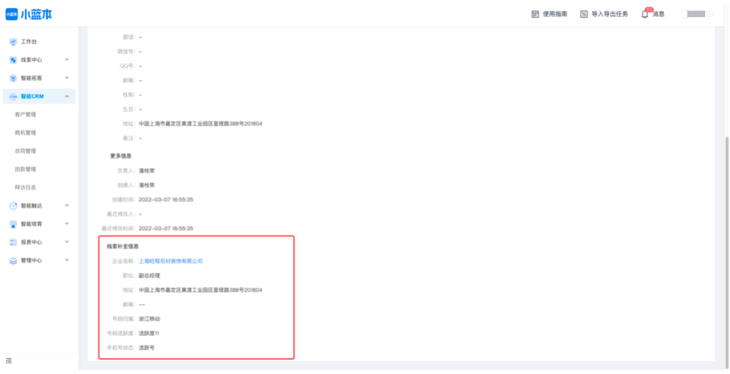 5.经过「线索补全」的线索,在线索详情页中新增「线索补全信息」模块,「企业名称」字段支持跳转到企业详情页。