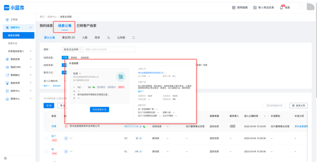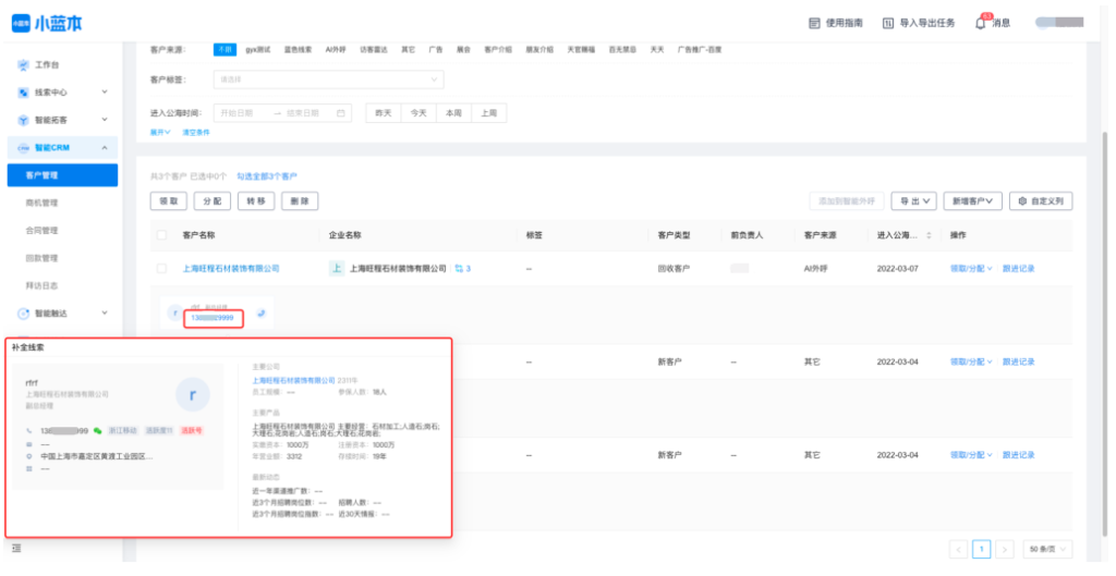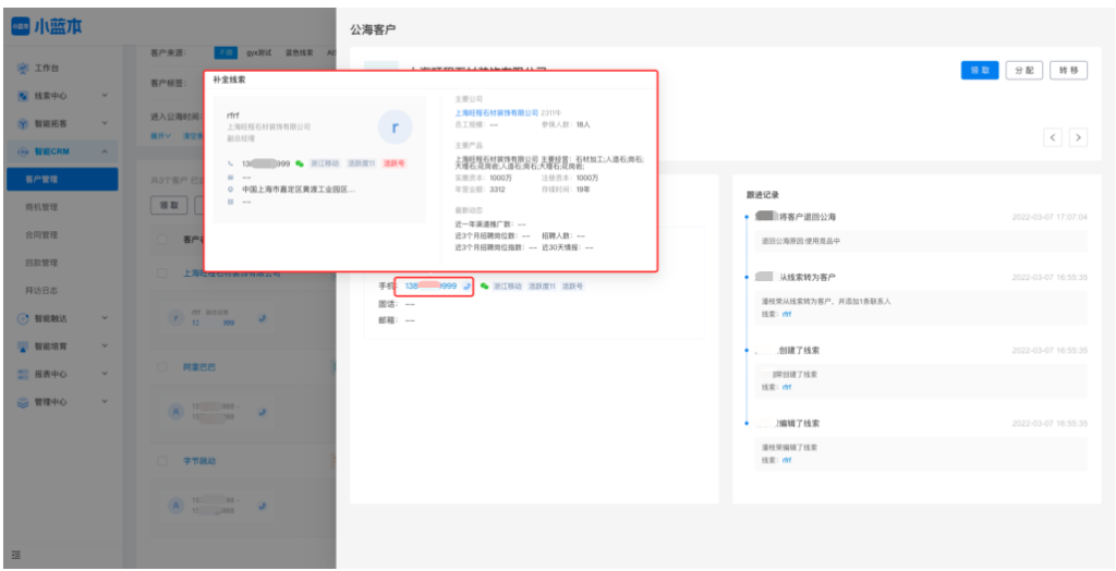 1.线索公海列表,经过线索补全的「手机号」高亮标蓝,悬浮弹窗展示「线索补全」信息。