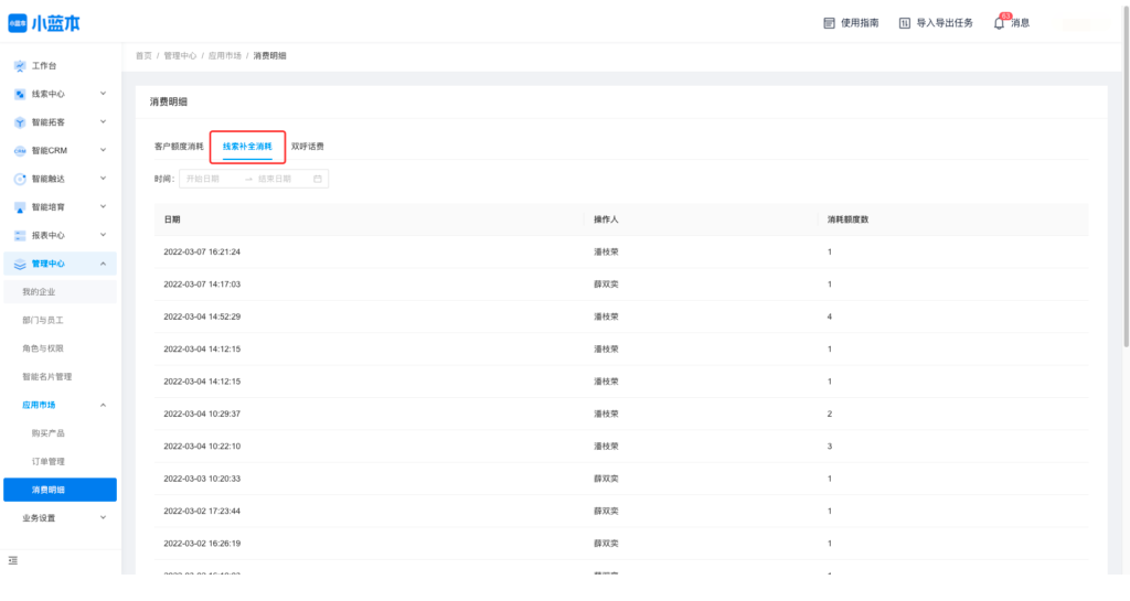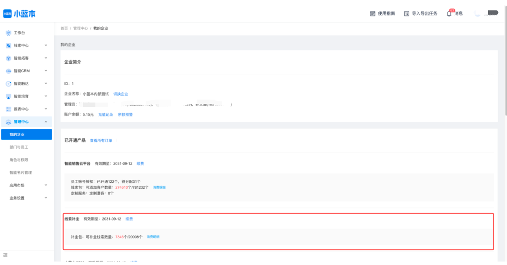 2.线索补全数量包消耗量查询入口:管理中心-我的企业-线索补全-补全包。