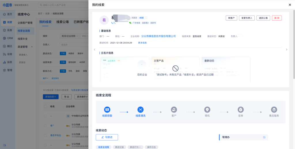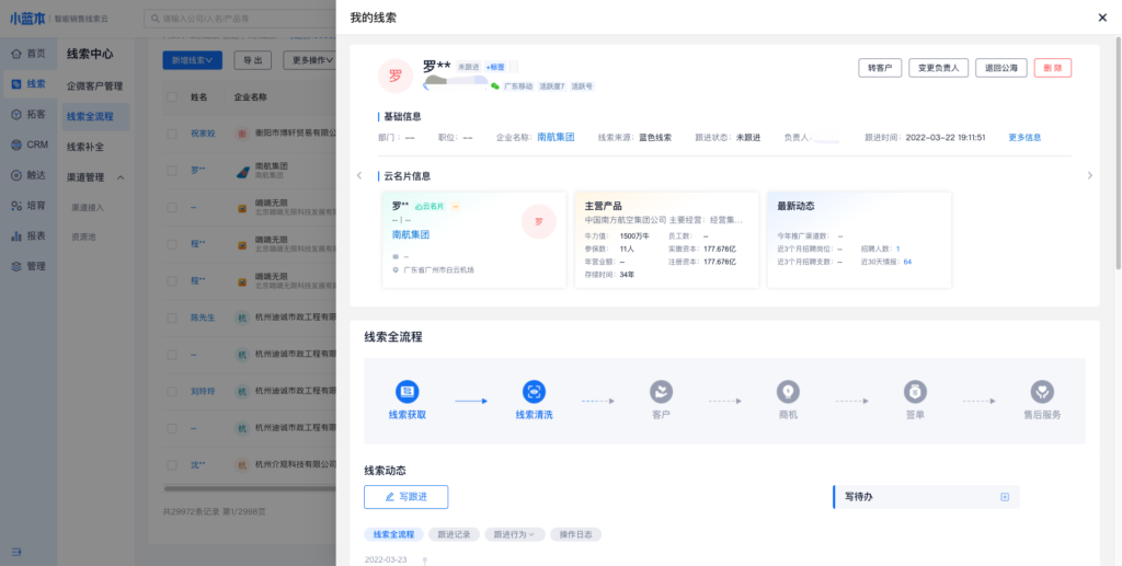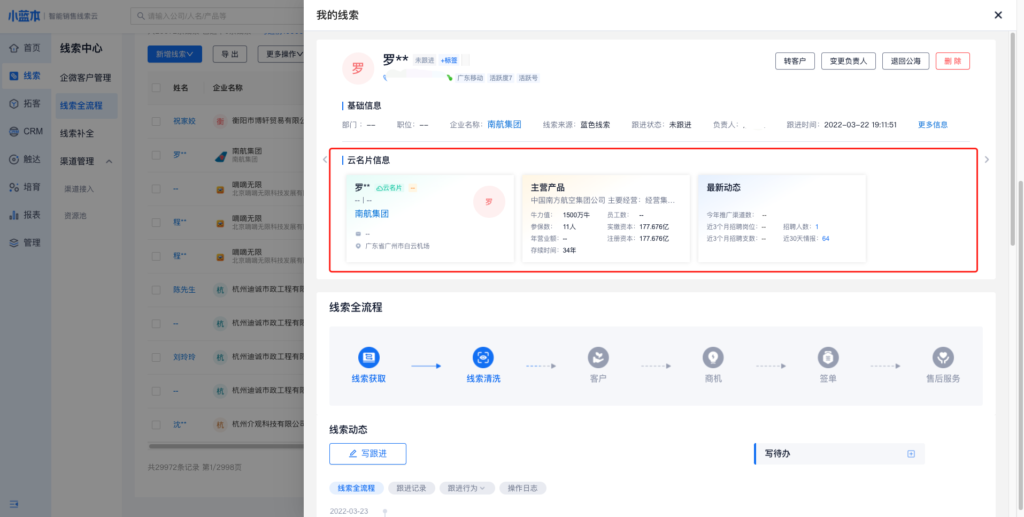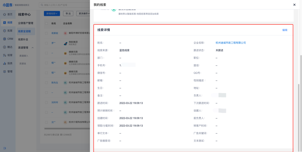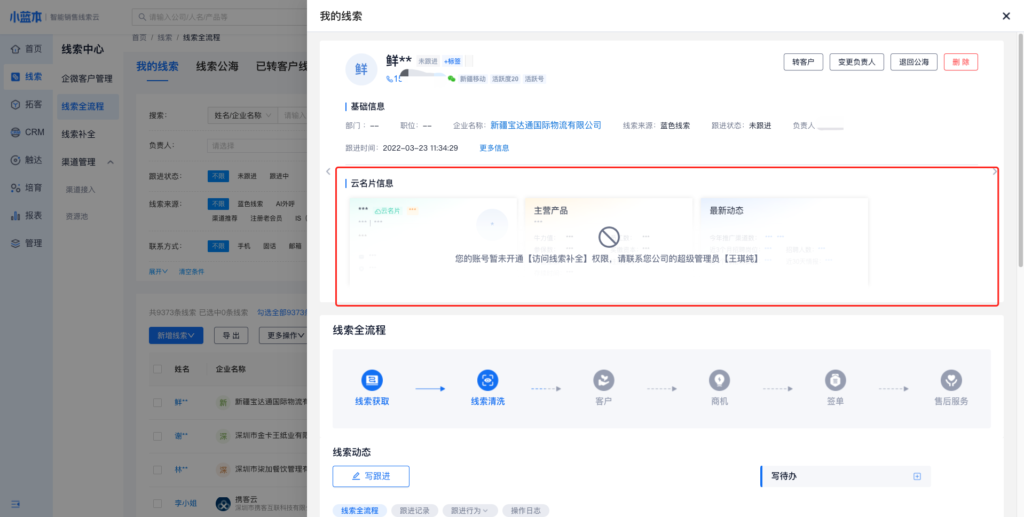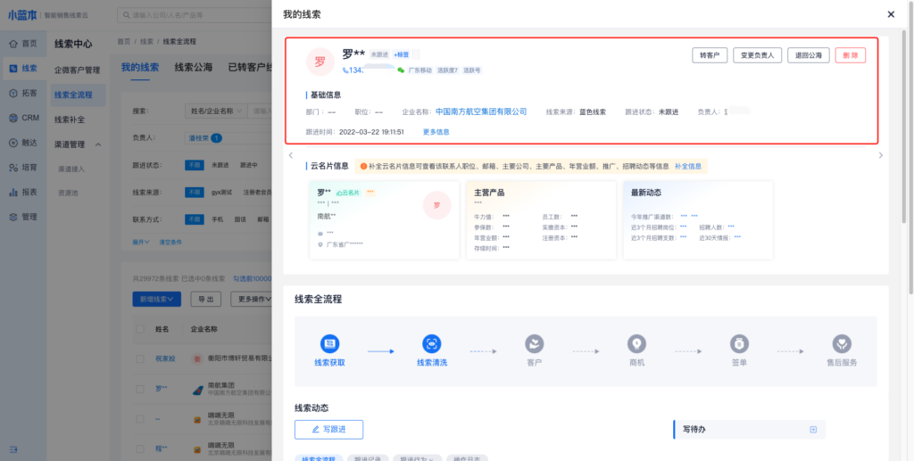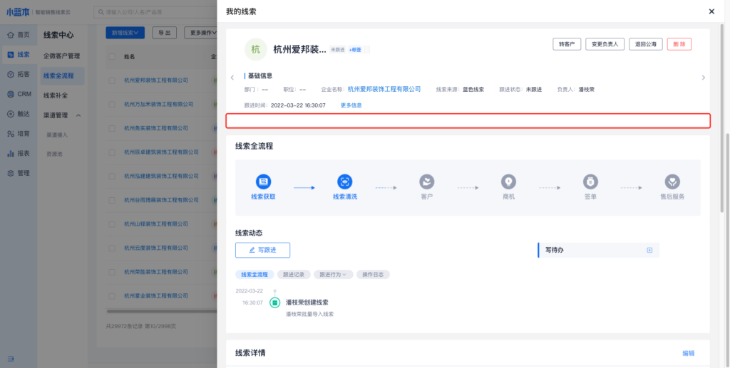 入口:线索中心-线索全流程(原智能CRM-线索管理)-线索详情页。