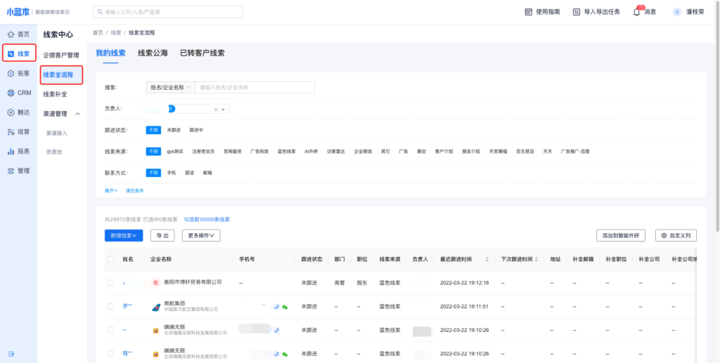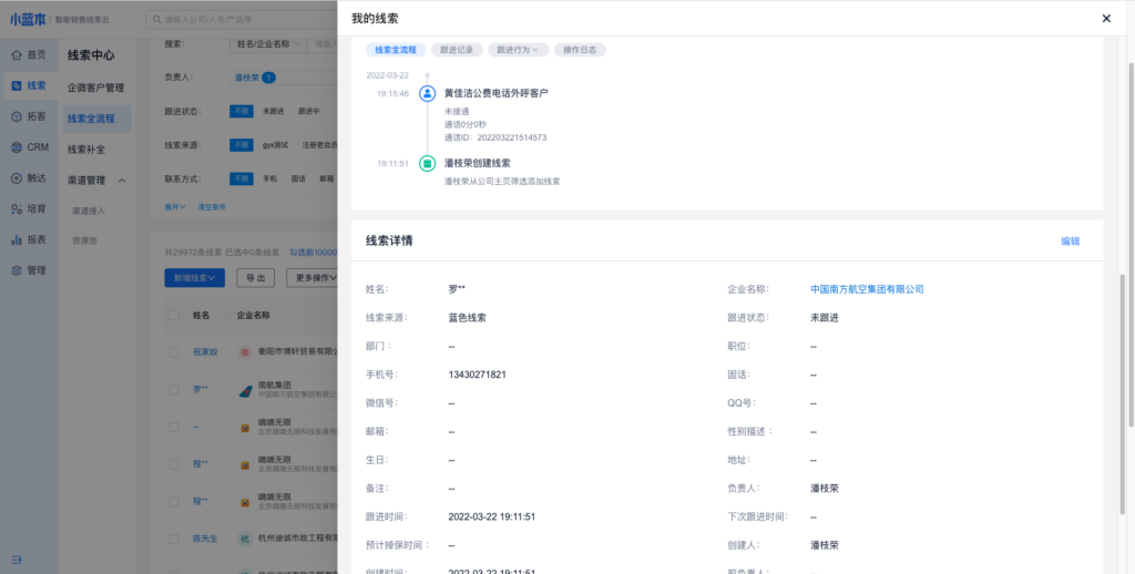 1.线索基础信息由线索名称(即联系人姓名)、联系人手机号、联系人手机号标签、联系人部门、职位、企业名称、线索来源、跟进状态、负责人、跟进时间字段组成。