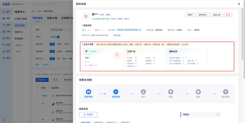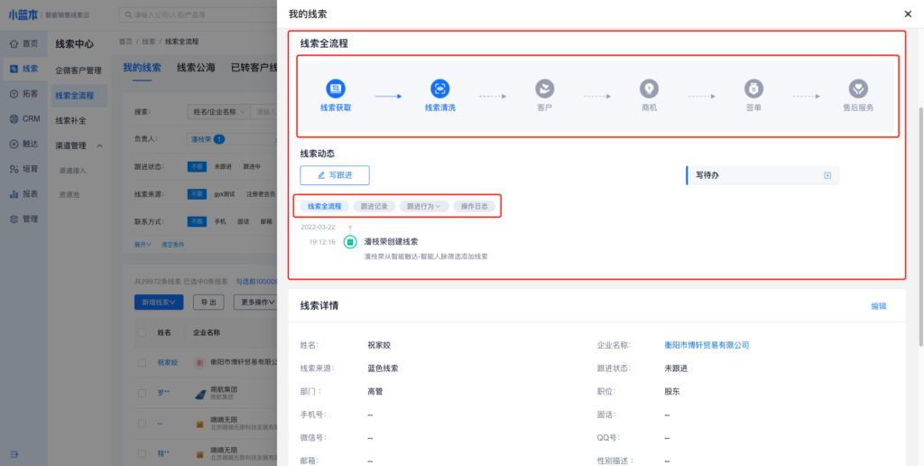 线索全流程,即线索生命周期管理,分为线索获取、线索清洗、客户、商机、售后服务5个阶段。以生命周期维度呈现线索详情,详实记录线索在系统中流转步骤,实现全流程可追溯,为线索分析提供数据基础。