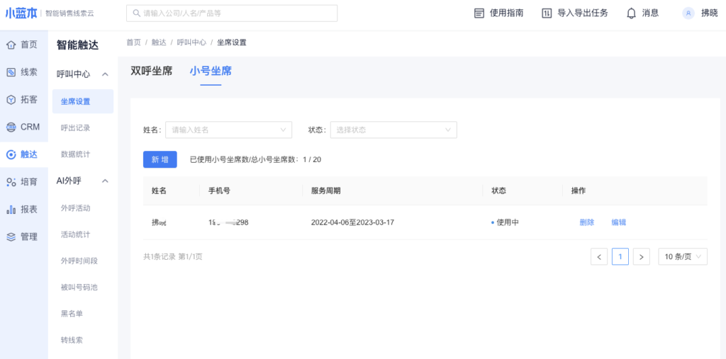 1、进入呼叫中心 – 小号座席,点击【新增】创建小号坐席,有小号坐席的员工才能进行小号外呼