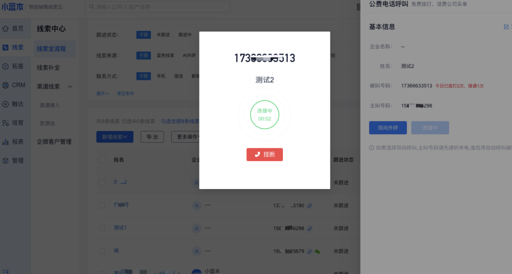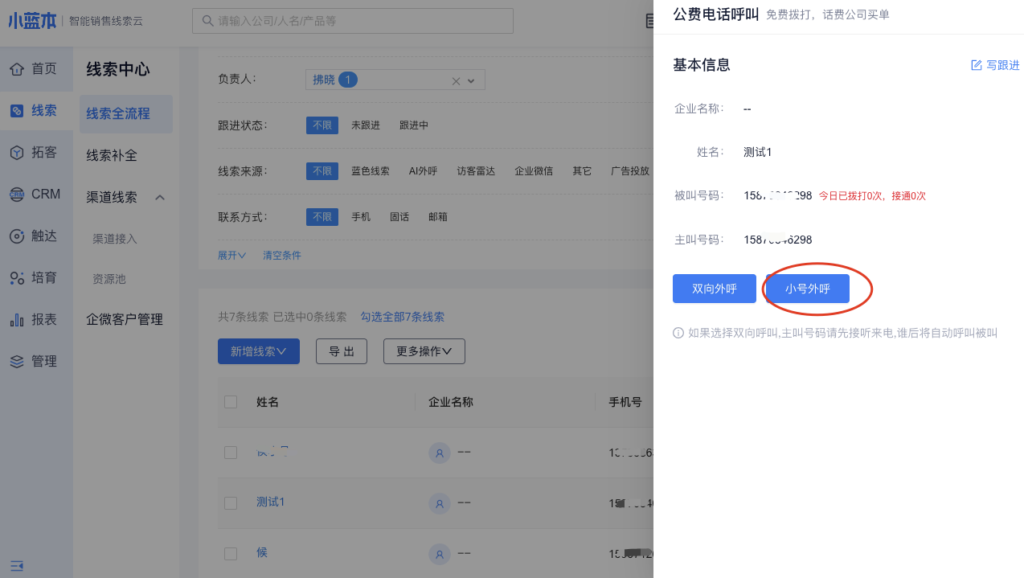 小号外呼是另外一种外呼形式,不同于双向外呼,主叫无需通过手机拨号,在小蓝本PC端内点击号码便可呼起被叫,更加高效便捷。小号外呼时,外显号码为特定小号,不显示主叫号码,无法回拨。
