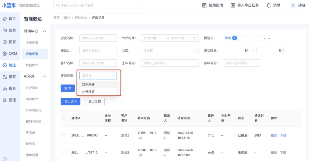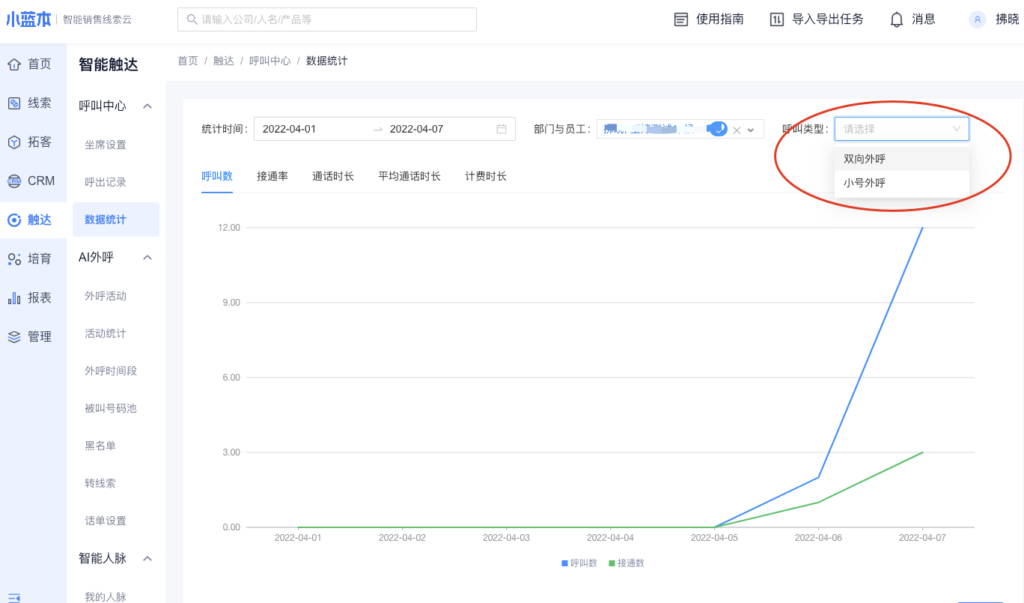 通过筛选呼叫类型,可以单独查看小号外呼的呼出记录、数据统计