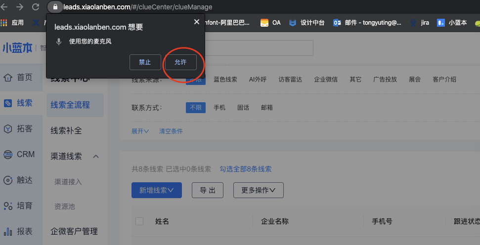应用内有拨号标志的都可以进行小号外呼,点击拨号进入公费电话呼叫页面,选择【小号外呼】进行呼叫。首次使用小号外呼需要授权浏览器麦克风,请选择同意。