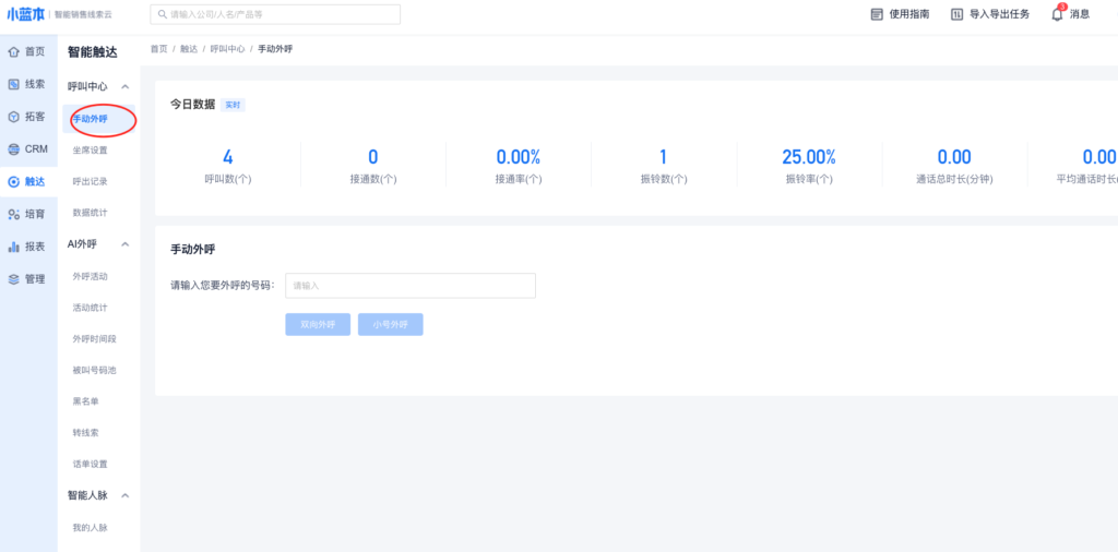 1、进入【触达】-【呼叫中心】-【手动外呼】,输入手机号后,选择呼叫方式即可发起呼叫。