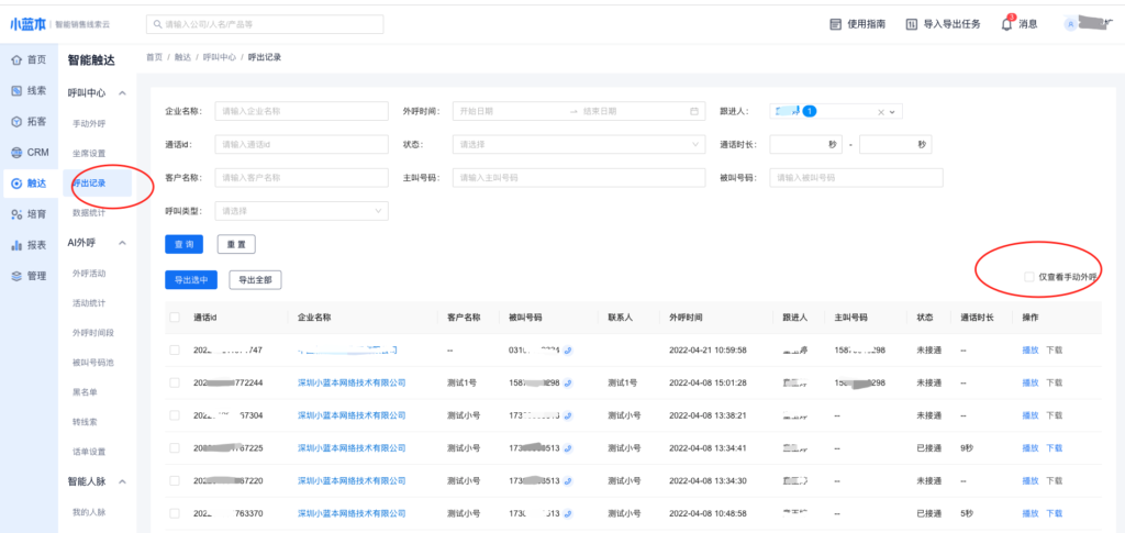 在【呼出记录】内可查看所有类型的呼出记录。点击【仅查看手动外呼】时,可以仅查看手动外呼的通话记录