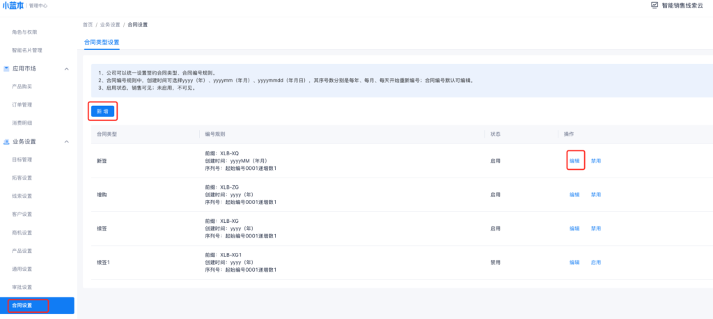 在【管理中心-业务设置-合同设置】可以自定义合同类型和合同编号规则。