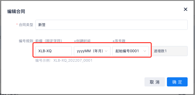 合同编号规则由「前缀-创建时间-序号数]组成,前缀可自定义,创建时间可选择:yyyy(年)、yyyymm(年月)、yyyymmdd(年月日),序号数可选择:1、01、001、0001、00001几种类型,递增数默认为1。